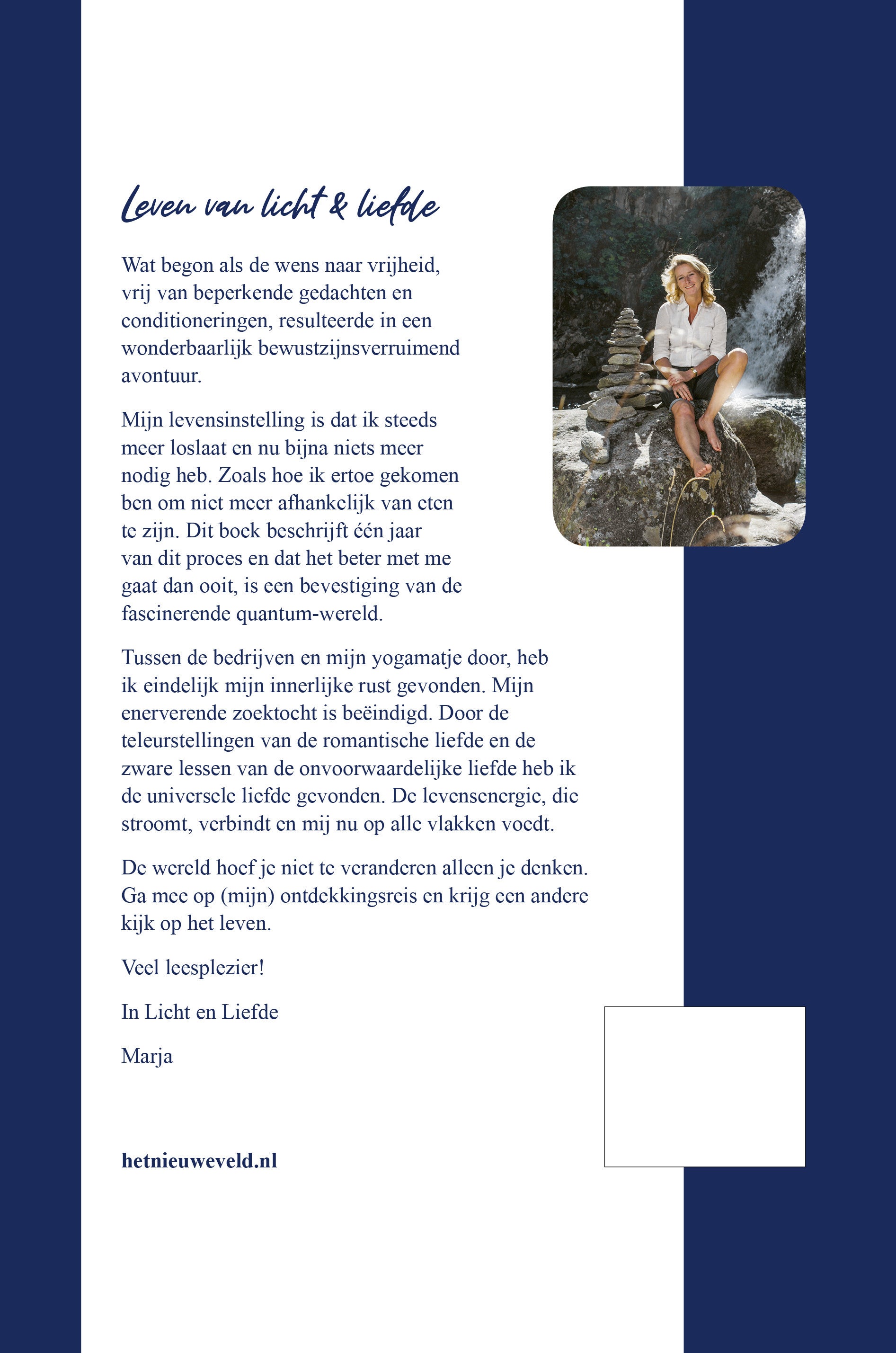 Tussen de bedrijven en mijn yogamatje door, heb ik eindelijk mijn innerlijke rust gevonden. Mijn enerverende zoektocht naar liefde is beëindigd. Het is een alles verbindende levensenergie die mij nu op alle vlakken voedt. Mijn levensinstelling is dat ik steeds meer loslaat en daardoor bijna niets meer nodig heb. Zoals hoe ik ertoe gekomen ben om niet meer afhankelijk van eten te zijn. Dit boek beschrijft één jaar van dit proces en dat het beter met me gaat dan ooit, is een bevestiging van de fascinerende quantum-wereld.